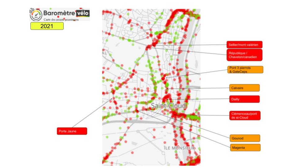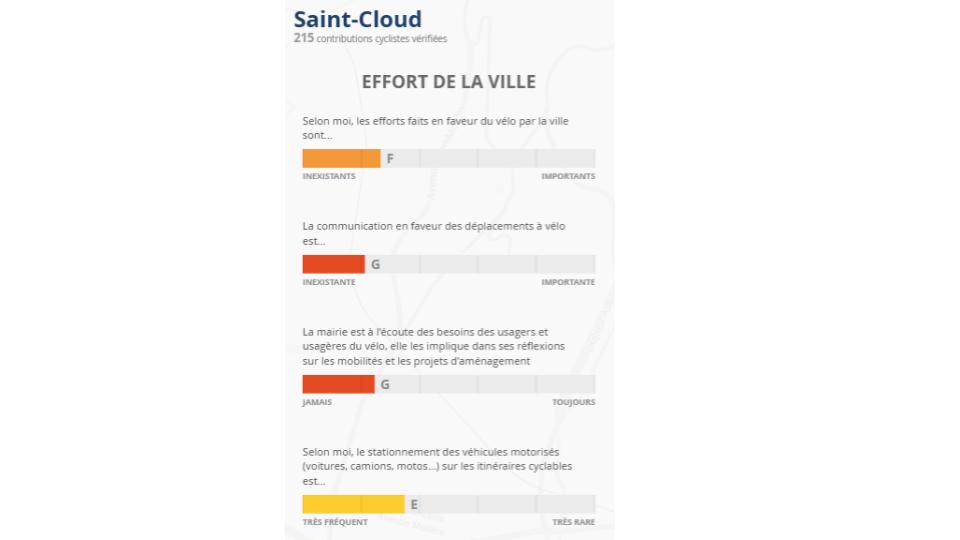 La ville de Saint-Cloud est une des seules 36 communes des hauts de seine qui n’a pas progressé, et se retrouve dans le bas ( 33ème) du classement des 36 communes alto-séquanaise avec Fontenay-aux-rose et Boulogne Billancourt. Ceci est d’autant plus regrettable que notre département se distingue particulièrement lors de cette édition du baromètre vélo comme étant “LE” département du vélo en banlieue parisienne.