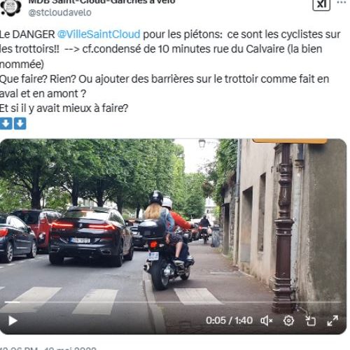 Une analyse que conteste le maire de Saint-Cloud, Éric Berdoati (DVD). « Il est interdit de rouler à vélo sur un trottoir quand on a plus de huit ans. Il y a une vraie déliquescence du respect du Code de la route de la part des cyclistes, et par capillarité, des deux-roues motorisés qui se croient tout permis et qui sont beaucoup moins durement réprimés que les automobilistes. C’est devenu le Far-west ! Des contrôles sont effectués par les polices nationale et municipale, qui dressent de nombreuses verbalisations. Des croix de Saint-André ont été posées à cet endroit, mais on ne peut pas en mettre partout car il faut notamment que les poussettes puissent cheminer. La police ne peut pas effectuer des contrôles tous les jours, nous sommes donc un peu désarmés. »
